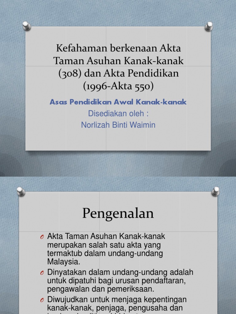 Akta pendidikan yang berkaitan dengan prasekolah. Pendidikan 13 undang undang malaysia akta 550 akta pendidikan 1996 suatu akta untuk mengadakan peruntukan bagi pendidikan dan bagi perkara yang berkaitan dengannya. Pada 1 april lalu kerajaan telah meluluskan penetapan kelayakan akademik minimum iaitu diploma pendidikan awal kanak kanak bagi guru prasekolah di malaysia.