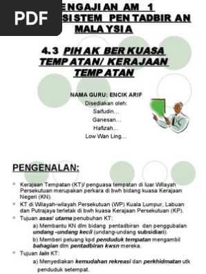 Kuasa eksekutif sultan ydp negeri. Kuasa kerajaan negeri terhadap kerajaan tempatan mengisytiharkan sesuatu kawasan dlm negeri menjadi kawasan kerajaan tempatan. 5 4 1 struktur pentadbiran kerajaantempatan kerajaan tempatan merupakan peringkat ketiga dalam hierarki pentadbiran kerajaan malaysia. Kerajaan tempatan bertanggungjawab untuk merancang menyelaras dan mengawal penggunaan serta aktiviti memajukan tanah.