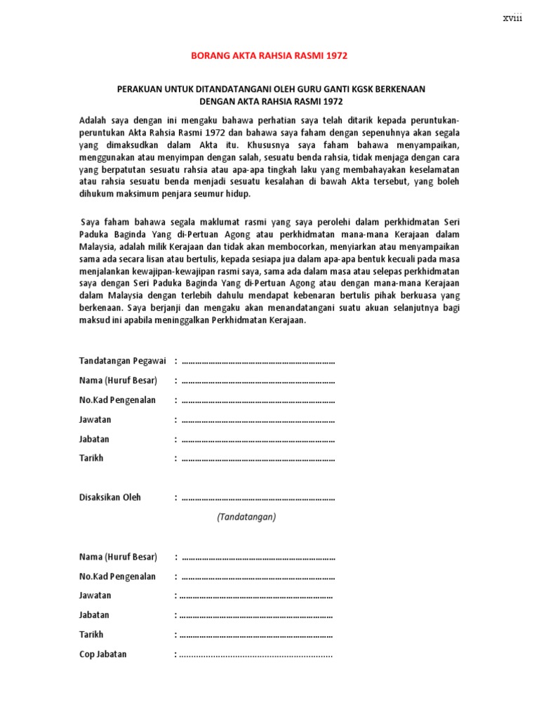 Borang permohonan pendaftaran pemegang amanah. Borang permohonan pendaftaran pemegang amanah. Lampiran d akta rahsia rasmi 1972 t e r h a d lampiran d perakuan untuk ditandatangani oleh penjawat awam berkenaan dengan akta rahsia rasmi 1972 adalah saya dengan ini mengaku bahawa perhatian saya telah ditarik kepada peruntukan peruntukan akta rahsia rasmi 1972 dan bahawa saya faham dengan sepenuhnya akan segala yang dimaksudkan. Seminar perbandingan akta rahsia rasmi dan.