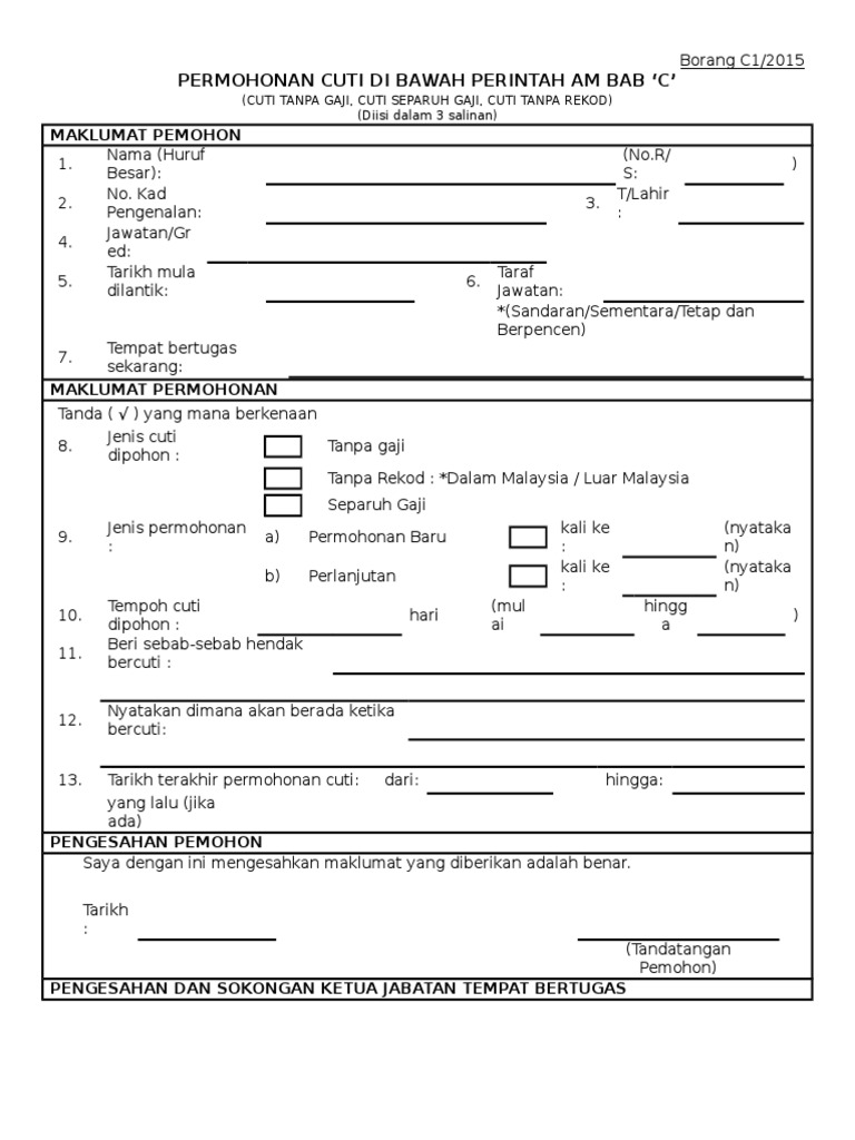 Borang permohonan cuti tanpa rekod saya memohon cuti tanpa rekod selama jawatan hari mulai dari. Tuan saya memohon cuti tanpa rekod selama. Facebook twitter newer post older post search here. Maklumat hendaklah dilengkapkan dengan jelas dan menggunakan huruf besar.