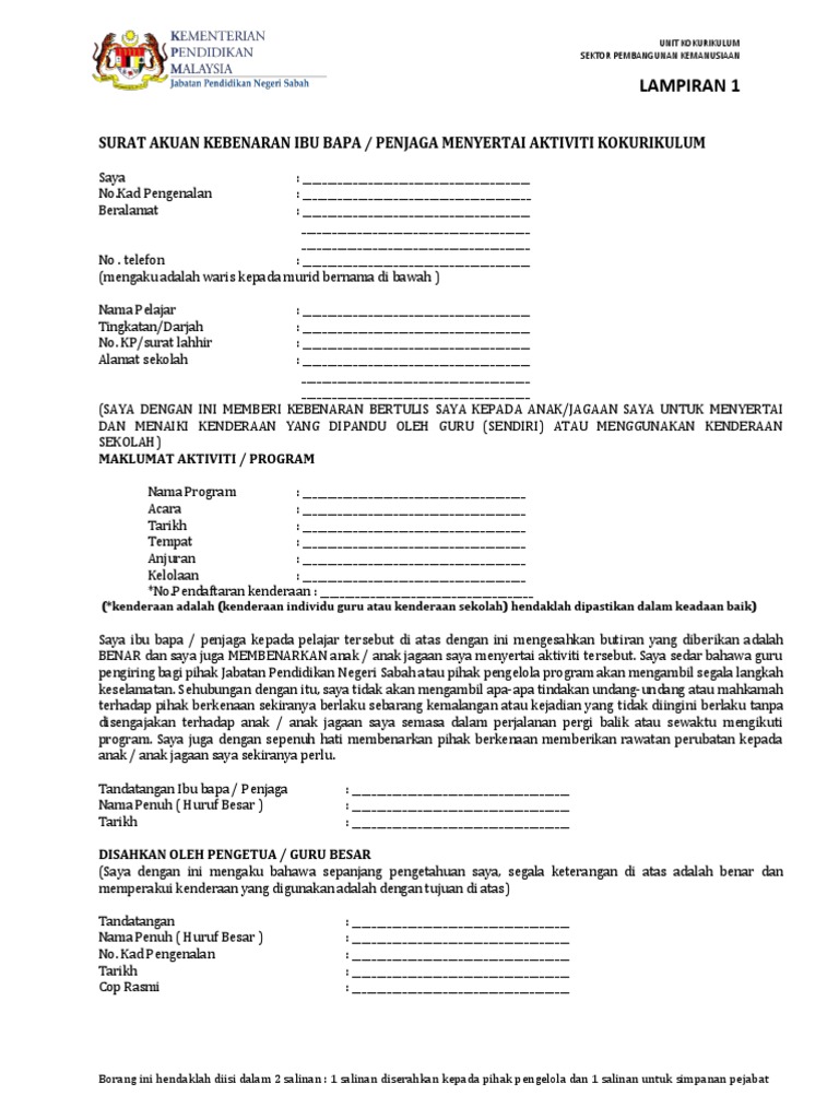 Surat akuan kebenaran ibu bapa dan penjaga menyertai aktiviti kokurikulum. Saya dengan ini memberi kebenaran bertulis saya kepada anak jagaan saya untuk menyertai. Mengedarkan borang kebenaran ibu bapa dan kumpulkan semula sebelum aktiviti dijalankan. Dalam menjalankan aktiviti kokurikulum sama ada di luar atau di dalam sekolah amat penting untuk murid mendapat kebenaran daripada ibu bapa untuk menyertai aktiviti tersebut.