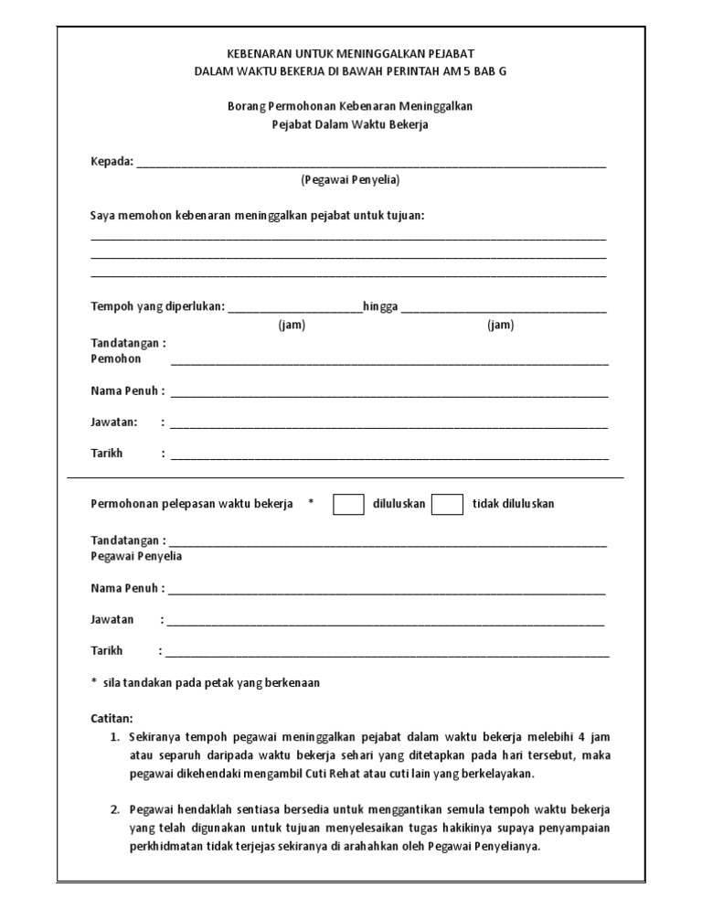 Borang keluar waktu pejabat. Borang permohonan kebenaran meninggalkan. Sekiranya tempoh pegawai meninggalkan pejabat dalam waktu bekerja melebihi 4 jam atau separuh daripada waktu bekerja sehari yang ditetapkan pada hari tersebut maka pegawai dikehendaki mengambil cuti rehat atau cuti lain yang berkelayakan. Borang permohonan kebenaran meninggalkan. Sekiranya tempoh pegawai meninggalkan pejabat dalam waktu bekerja melebihi 4 jam atau separuh daripada waktu bekerja sehari yang ditetapkan pada hari tersebut maka pegawai dikehendaki mengambil cuti rehat atau cuti lain yang berkelayakan.