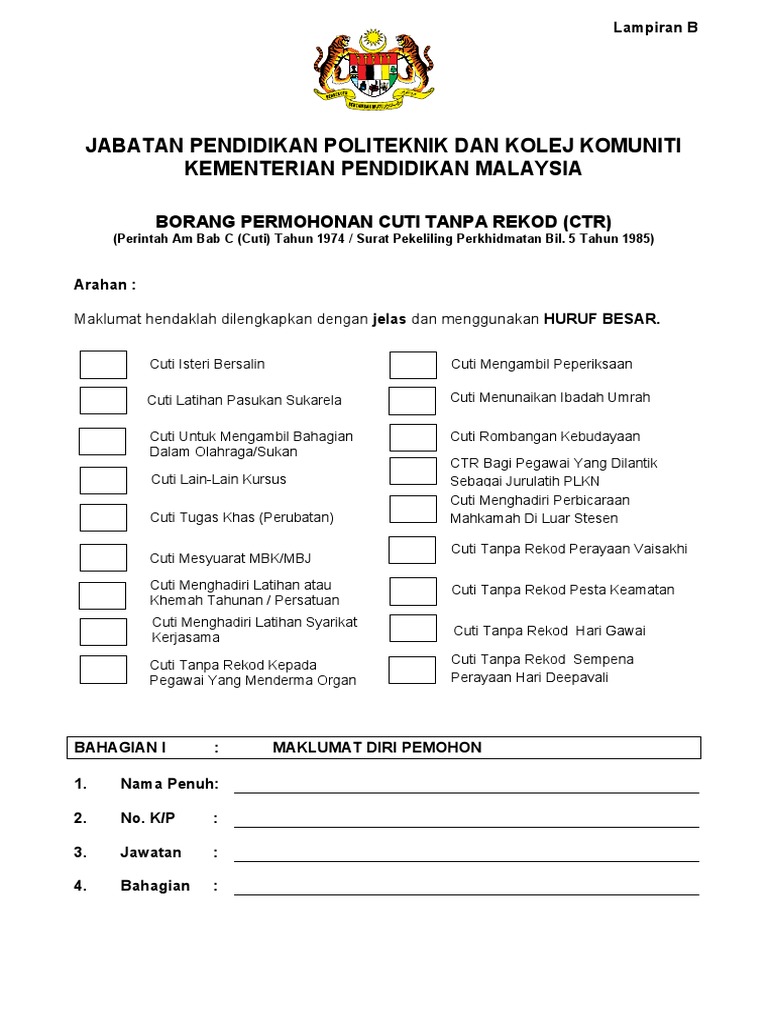 Norshabillah binti abu bakar created date. 9 2002 diisi dalam dua 3 salinan nota. Bagi staf berstatus kontrak kemudahan cuti tanpa rekod adalah terhad kepada cuti isteri bersalin dan cuti urusan kematian ahli keluarga terdekat sahaja. 4 18 2017 9 49 17 am.