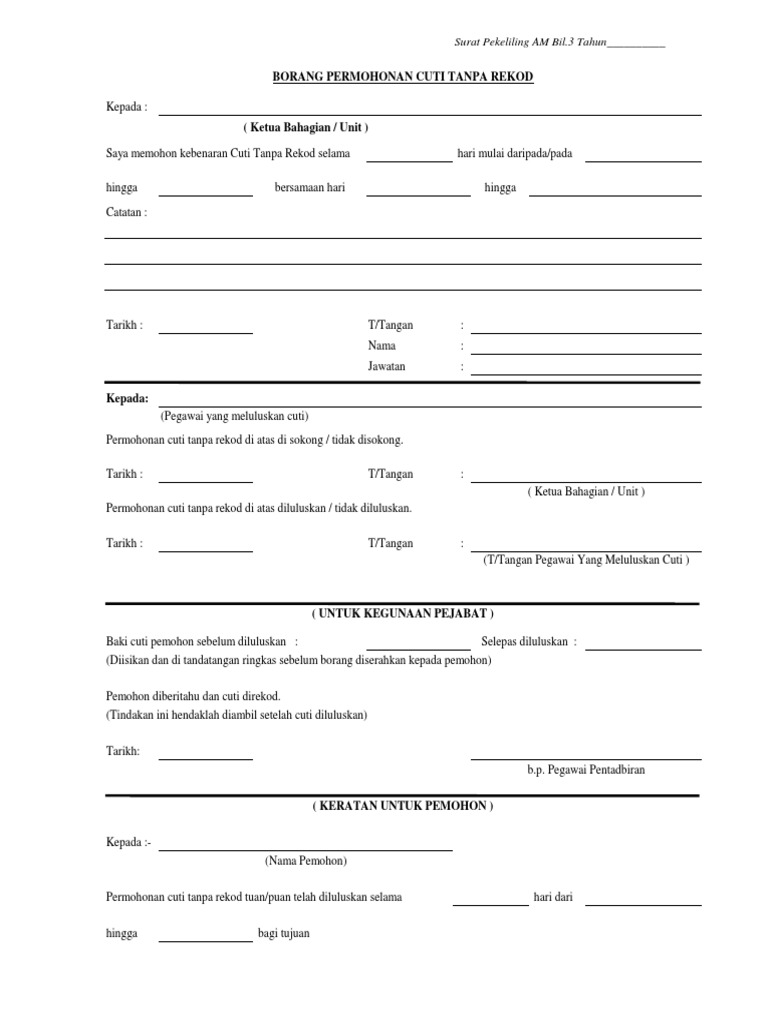 Oleh yang demikian ketua jabatan adalah bertanggungjawab dalam membuat pertimbangan terhadap permohonan bagi kemudahan cuti tidak berekod kepada pegawai bagi menghadiri peperiksaan yang dirasakan oleh ketua jabatan boleh membaiki peluang hidup. Borang permohonan cuti permohonan cuti tanpa rekod menduduki peperiksaan di bawah perkara 44 perintah a bab c dan pekeliling perkhidmatan bil 9 tahun 1991 pin slideshare uses cookies to improve functionality and performance and to provide you with relevant advertising. Nyatakan berapa kali telah membuat permohonan cuti tanpa rekod pada tahun semasa. 2 untuk makluman tuan saya akan menduduki peperiksaan pertengahan semester bagi sesi januari 2016 2017 program pendidikan jarak jauh pjj yang akan diadakan pada 18 19 mac 2016 jumaat sabtu.