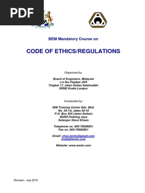 Iem training centre sdn. Bem mandatory course on code of ethics regulations 22 23 july 2013 iem miri. 1 1 a professional engineer shall approve and sign only those engineering documents that he has prepared or are prepared under his direct supervision. Act 1967 act 138 the board of engineers malaysia hereby determines the code of conduct of registered person as stated herein below.