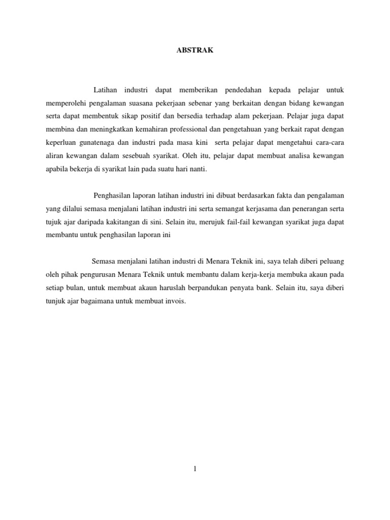 Contoh abstrak latihan industri. Pasti kamu sudah tidak asing lagi mendengar kata kata ini. Ini kerana apabila pelajar menghadapi alam pekerjaan kelak pelajar tidak akan mengalami kejutan budaya bekerja. Facebook twitter newer post older post search here. Senarai kandungan kandungan mukasurat halaman judul perakuan penghargaan abstrak senarai kandungan senarai rajah senarai jadual senarai lampiran i ii iii v vi vi vii bab 1 pengenalan dan latar belakang organisasi 1 1 pengenalan 1 1 1 pendahuluan 1 1 2 objektif latihan industri 1 1 3 kepentingan latihan industri 1 1 4 objektif laporan latihan industri 1 1 5 skop latihan industri 1 2 latar.