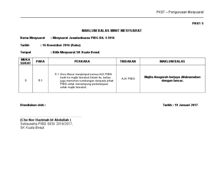 Maklum balas perlaksanaan keputusan mesyuarat mesyuarat majlis permuafakatan pengarah kv ilp dan pengetua smt zon melaka negeri sembilan bil 3 tahun 2014 bil rujukan perkara untuk tindakan maklumbalas 1. Bilik mesyuarat tingkat 6 pejabat kewangan dan perbendaharaan negeri pahang bil rujukan perkara untuk tindakan maklum balas 1 5 1 mewujudkan slot mbj dalam laman web pkpn. Contoh maklum balas minit mesyuarat. No keluaran tarikh keluaran no pindaan tarikh pindaan tarikh berkuatkuasa 06 01 disember 2016 0 0 3 januari 2017 pk15 1.