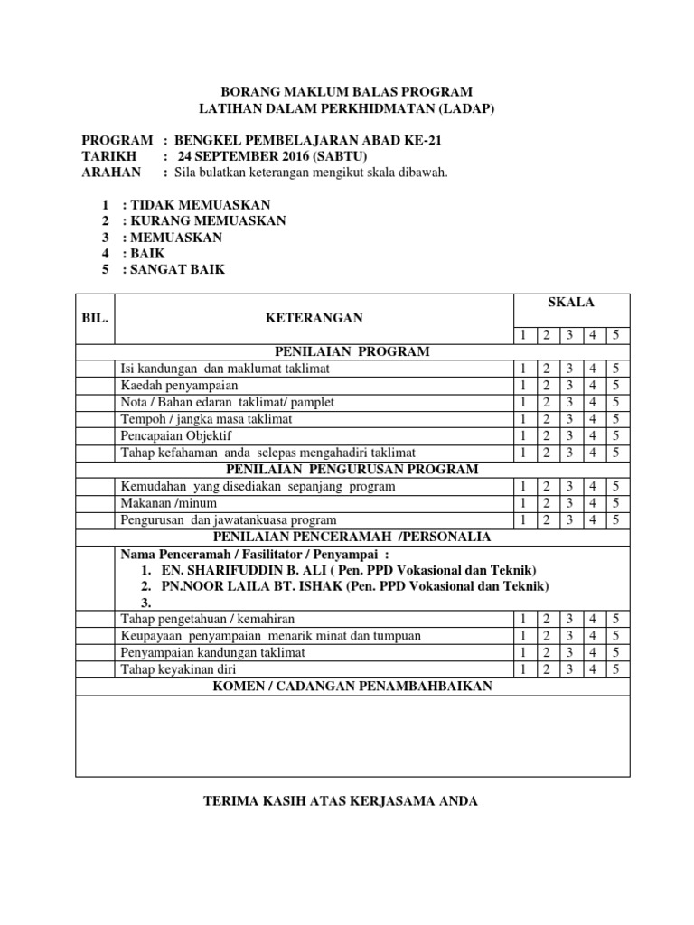 Contoh borang maklum balas program. Simpan simpan borang maklum balas pelanggan untuk nanti. Academia edu is a platform for academics to share research papers. Maklum balas perlaksanaan keputusan mesyuarat mesyuarat majlis permuafakatan pengarah kv ilp dan pengetua smt zon melaka negeri sembilan bil 3 tahun 2014 bil rujukan perkara untuk tindakan maklumbalas 1. Borang maklum balas pelanggan telah diterima dan diproses.