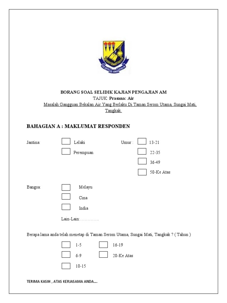 1 kaedah soal selidik samb 1 6 2 soal selidik diserahkan secara pos kiriman kelebihan dapat mengukur lebih banyak subjek menjimatkan masa belanja dan tenaga kelemahan sukar mendapatkan kerjasama subjek menjawab dengan lengkap serta memulangkan kembali soalselidik. Contoh borang soal selidik tesis pdf encuesta contoh borang soal selidik tesis definicion contoh borang soal selidik tesis de administracion contoh borang soal selidik tesis de grado contoh borang soal selidik tesis doctorales contoh borang soal selidik tesis significado contoh borang soal selidik pengajian am contoh borang soal selidik. Borang soal selidik kepada tuan tuan yang dihormati adalah dimaklumkan bahawa saya sedang mengikuti progran ijazah sarjana pengurusan dari universiti malaya. Borang soal selidik borang soal selidik ini dikemukakan untuk mendapatkan maklum balas dan menilai persepsi masyarakat melayu di daerah pengkalan hulu perak terhadap haiwan fasiq.