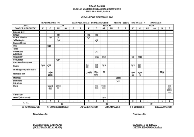 Contoh jsu jadual. Of question elementary intermediate advance a vocabulary 1 4 word level noun 2 1 action words adjectives part of body 1 5 7 phrase level noun 1 collective noun 1 verb 1 8 10 sentence level sentences to describe pictures 1 1 1 b social. Contoh jadual spesifikasi ujian pendidikan moral. Contoh jadual spesifikasi ujian jsu jadual spesifikasi ujian bmm 3108 fonetik dan fonologi bahasa melayu kumpulan 4.