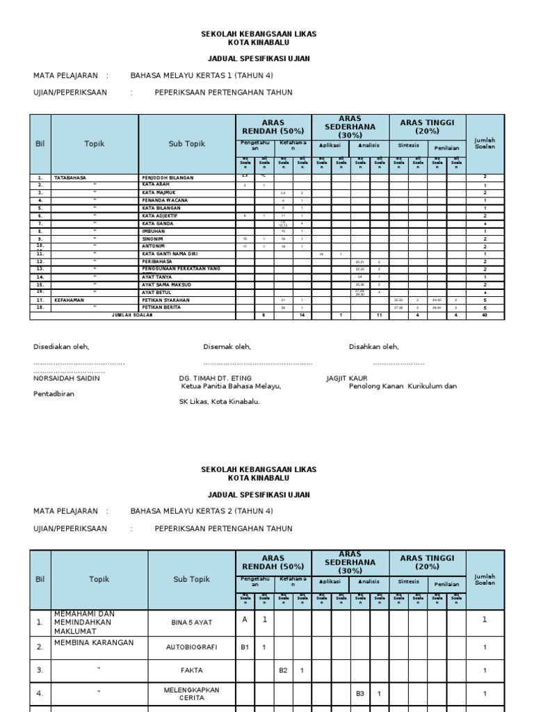We use your linkedin profile and activity data to personalize ads and to show you more relevant ads. Bahasa melayu k1 bahasa melayu k2 bahasa inggeris k1 bahasa inggeris k2 matematik. Contoh jadual justifikasi ujian bahasa melayu tahun 5 jaduan spesifikasi ujian. Aras aplikasi 4.