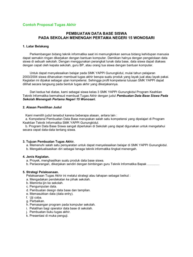 Contoh proposal projek tahun akhir. Contoh dan penjelasannya melalui pemaparan contoh baik sistematika maupun judul diharapkan pembaca dapat menemukan inspirasi untuk penyelesaian pembuatan proposal tugas akhir di institusinya masing masing. Mohamad syukri abd rahaman. Pada pendahuluan berisikan tentang latar belakang rumusan masalah batasan masalah dan tujuan. Jump to page.