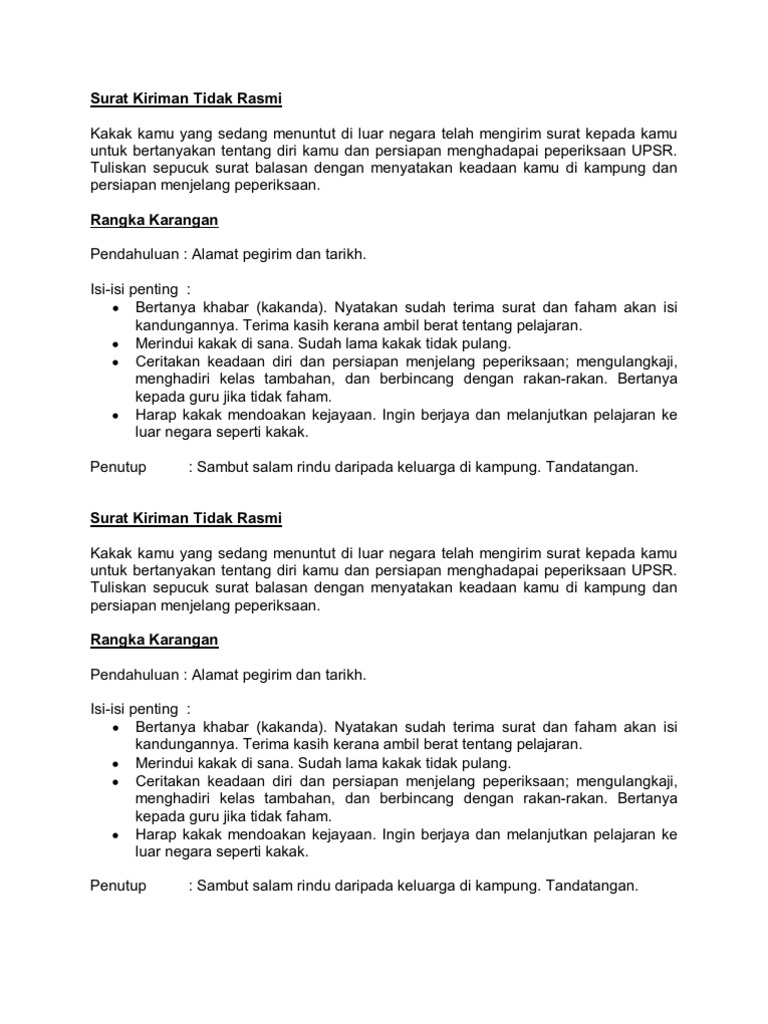 Berikut dikongsikan contoh surat kiriman tidak rasmi buat panduan semua. Memenuhi masa lapang andaikan bahawa anda baharu sahaja selesai menduduki peperiksaan upsr. Nyatakan juga langkah yang telah diambil untuk mengatasi masalah penyakit tersebut. Contoh surat tidak rasmi contoh surat kepada sahabat.