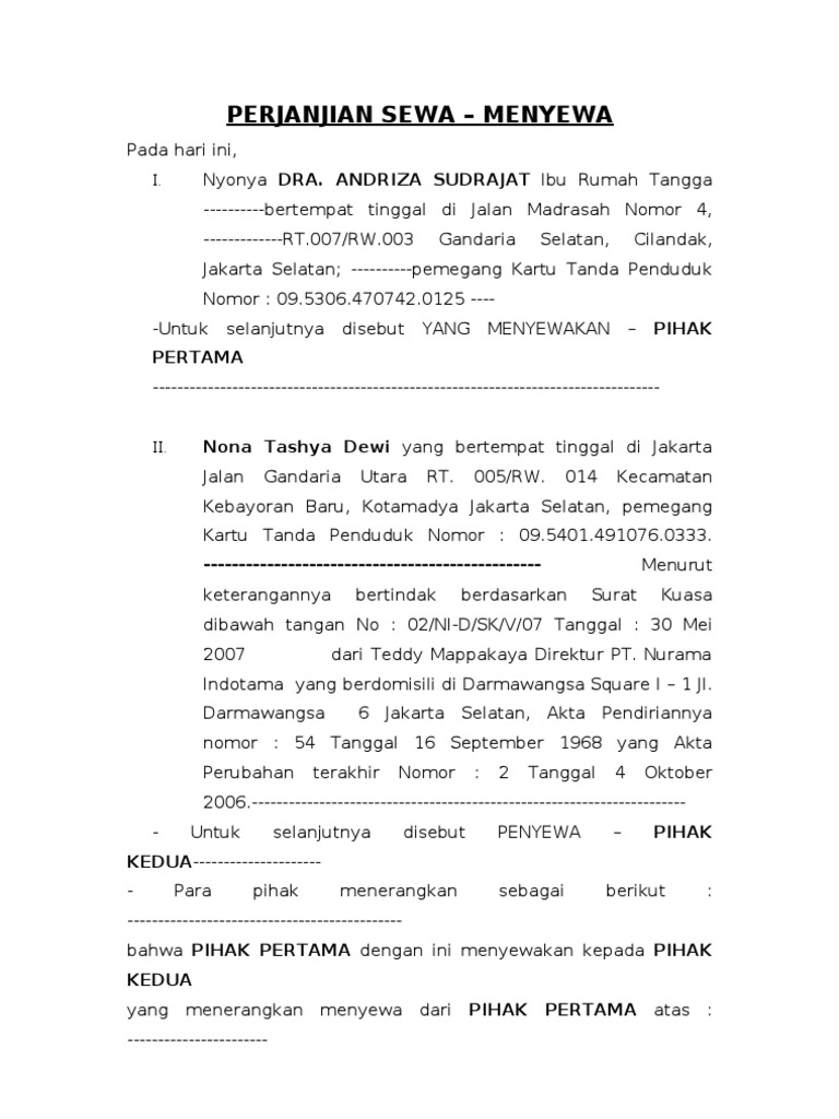 Surat perjanjian ini diperbuat pada 21 januari 2015 di antara pihak pihak berikut 1 gan chin seong no k p. Pihak pertama penyewa bertanggung jawab penuh atas kerusakan kehilangan maupun hal hal lain yang terjadi pada lokasi yang disewakan selama masa sewa masih berjalan. Pelaksanaan sewa menyewa kedai ini dapat dilakukan perpanjangan dengan ketentuan ketentuan dan prosedur yang akan ditentukan pada akhir masa sewa dengan dibuatnya perjanjian sewa kedai yang baru. Contoh surat perjanjian kontrak kerja sederhana yang mudah dipahami sehingga kesepakatan kerja antara karyawan dan perusahaan terstruktur.