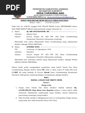 Untuk mengetahui sejauh mana peranan kepala desa dan perangkat pemerintahan desa dalam proses perjanjian sewa menyewa tanah kas desa. Begitupula dengan penyewaan sawah dan lahan pertanian untuk digarap pembuatan surat perjanjian sewa tanah pertanian atau surat perjanjian tanah sawah tentu diperlukan. Admin blog dapatkan contoh 2019 juga mengumpulkan gambar gambar lainnya terkait contoh surat perjanjian sewa tanah kas desa dibawah ini. Contoh perjanjian kontrak tanah bermacam macam penggunaannya seperti misalnya terdapat surat tanah dan bangunan maka anda harus membuat surat perjanjian sewa tanah dan bangunan.