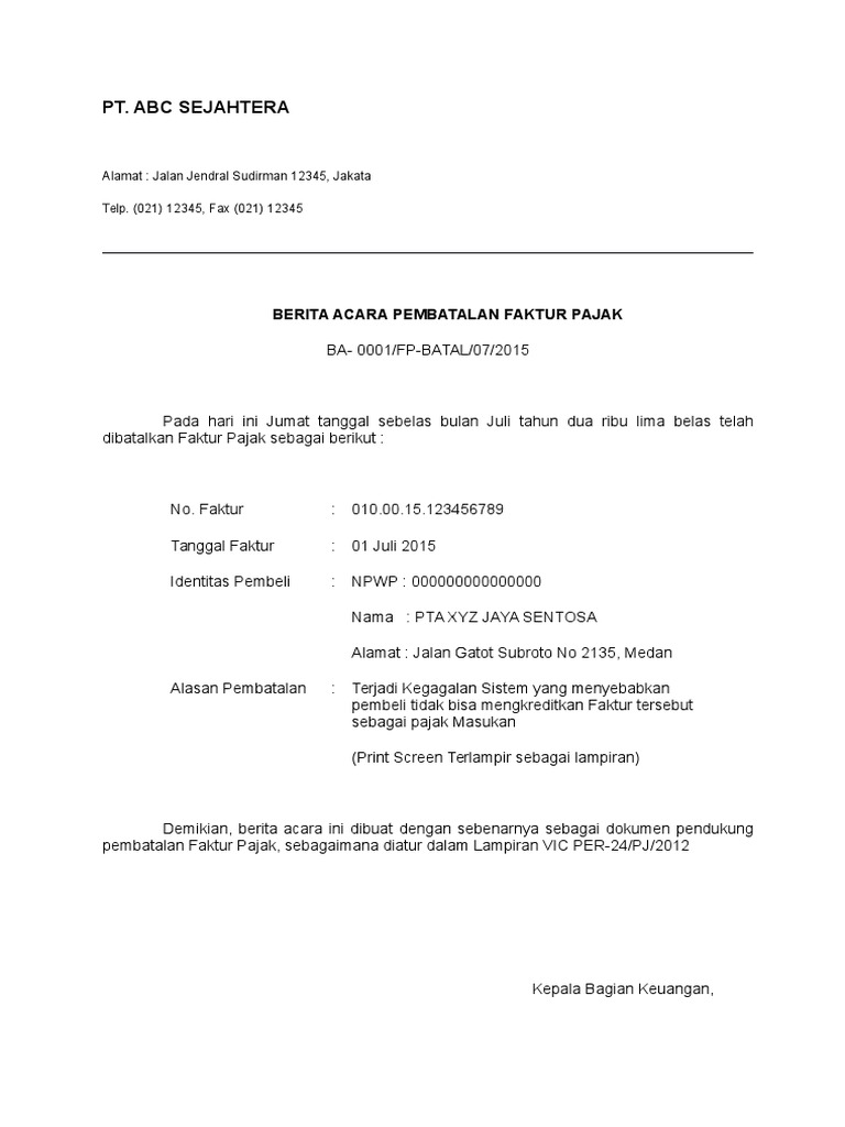 Contoh surat permohonan pembatalan faktur pajak. Contoh surat pembatalan faktur pajak. Dalam contoh surat pembatalan faktur pajak gawe cv telah memilihkan tema atau template yang terbaik untuk dijadikan inspirasi ide ataupun acuan dalam penulisan surat anda. Maksudnya pkp penjual harus memiliki bukti dari pkp pembeli berupa pernyataan tertulis bahwa terjadi pembatalan suatu transaksi. Sehingga disini kami akan memberitahukan contoh surat pembatalan faktur pajak.