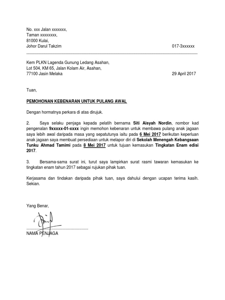 Surat rasmi memohon kebenaran balik awal surat kebenaran balik awal contoh surat rasmi kebenaran surat rasmi kebenaran keluar surat rasmi kebenaran syarikat contoh surat rasmi kebenaran lawatan contoh surat rasmi kebenaran menggunakan kenderaan contoh surat rasmi kebenaran ibu bapa contoh surat rasmi kebenaran keluar asrama surat rasmi tidak hadir ke sekolah surat rasmi kerajaan. The collection that consisting of chosen picture and the best among others. Contoh surat terlambat masuk kerja. Contoh surat izin pulang lebih awal.