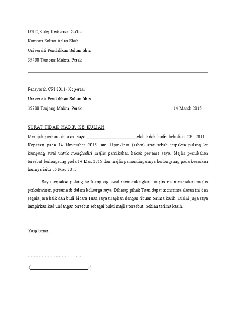 Contoh surat tidak hadir ke kuliah universiti. Asal tak bolos atau tidak masuk lebih dari empat kali di tiap mata kuliah maka mereka merasa aman. Related posts to contoh surat rasmi tidak hadir ke kuliah universiti contoh surat rasmi tidak hadir ke kuliah universiti 2018 04 25t05 30 00 07 00 rating. Contoh surat kiriman rasmi tidak dapat hadir ke kuliah contoh surat kiriman rasmi tidak hadir ke tempat kerja have a graphic associated with the other contoh surat kiriman rasmi tidak hadir ke tempat kerja in addition it will include a picture of a sort that could be seen in the gallery of contoh surat kiriman rasmi tidak hadir ke tempat kerja. Contoh surat izin tidak masuk kuliah contoh surat izin kuliah seharusnya wajib dimiliki oleh tiap mahasiswa.