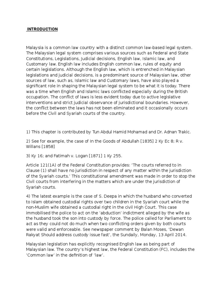 English law and it s application in malaysian court english law in virtue article 160 of federal constitution includes the common law in so far as it is in operation in the federation or any part thereof. The common law of england after the cut off date statutes of general application after 1951 1949 principles of common law in other countries common custom of people of malaysia etc. The civil law act 1956 act 67 revised 1972 cla 1965 being incorporate to all the three earlier statutes that are the statutory authority for the application of english law in today s malaysia. That qualification concern the extend to which english law is applicable.