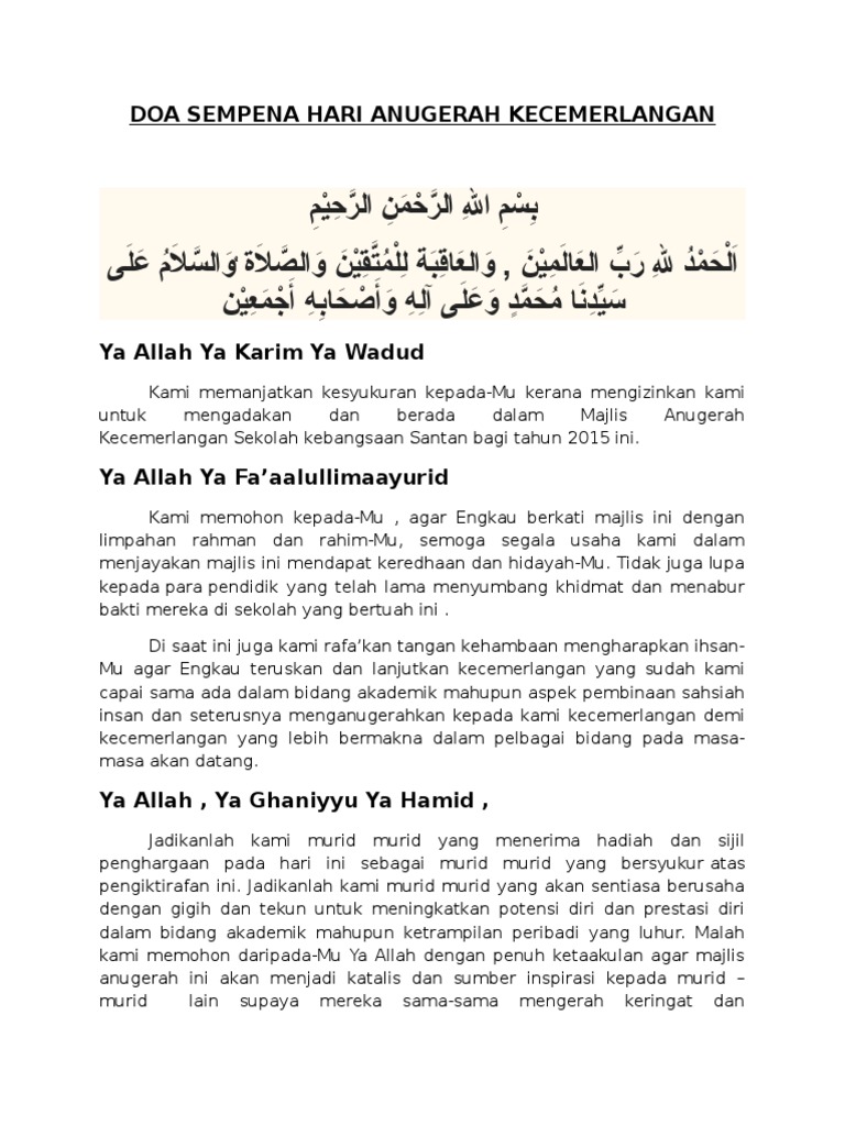 Doa majlis anugerah kecemerlangan pelajar. Kecemerlangan pelajar mencerminkan perkembangan serta kemajuan sekolah dalam melahirkan modal insan dan seterusnya membuktikan sekolah adalah sebagai satu institusi pendidikan yang berwibawa. Doa sempena hari anugerah kecemerlangan. Tak lengkap rasanya jika sesuatu majlis itu diadakan dengan tanpa iringan doa bagi memohon keselamatan dan keberkatan kepada semua yang terlibat dan juga menjamin kelancaran majlis tersebut. Malah kami memohon daripada mu ya allah dengan penuh kehambaan agar majlis anugerah ini akan menjadi sumber inspirasi kepada pelajar pelajar lain supaya mereka sama sama mengerah keringat dan menggembleng tenaga untuk mencapai kecemerlangan demi mengharumkan nama sekolah ini.