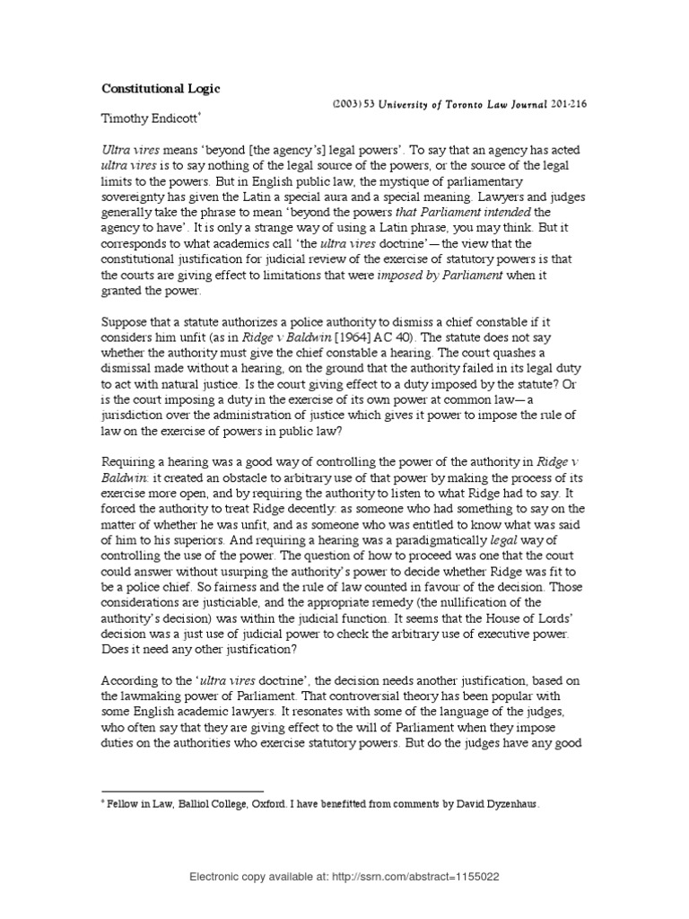 Doctrine of ultra vires in administrative law notes. The concept of ultra vires in the company law the ultra vires mean to go beyond the object clause of a memorandum of association of a company. Melissa bell law and government notes october 18 lecture ultra vires meaning of ultra vires the ultra vires concept generally when body acts beyond their power. The doctrine of ultra vires is a fundamental rule of company law. However both are void.