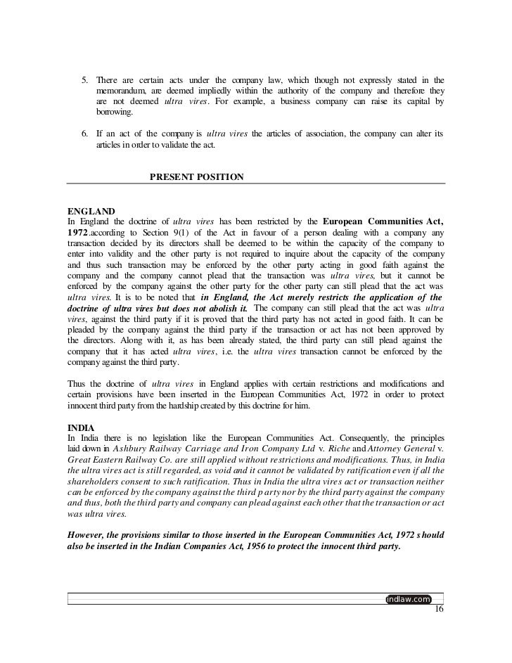 Since the application of the european community law in england the doctrine of ultra vires stand restricted to a certain extent in india the original of the doctrine dates back to 1866 when the bombay high court applied it to a joint stock. Summing up the doctrine of ultra vires. The ultra vires doctrine is a kind of insurance policy that reassures a company s shareholders and creditors that the company will not use their assets or funds for any purposes other than those that are afforded to it and specified within the ultra vires doctrine. Neither the company can sue nor it can be sued for such acts ashbury railway carriage and iron company v.