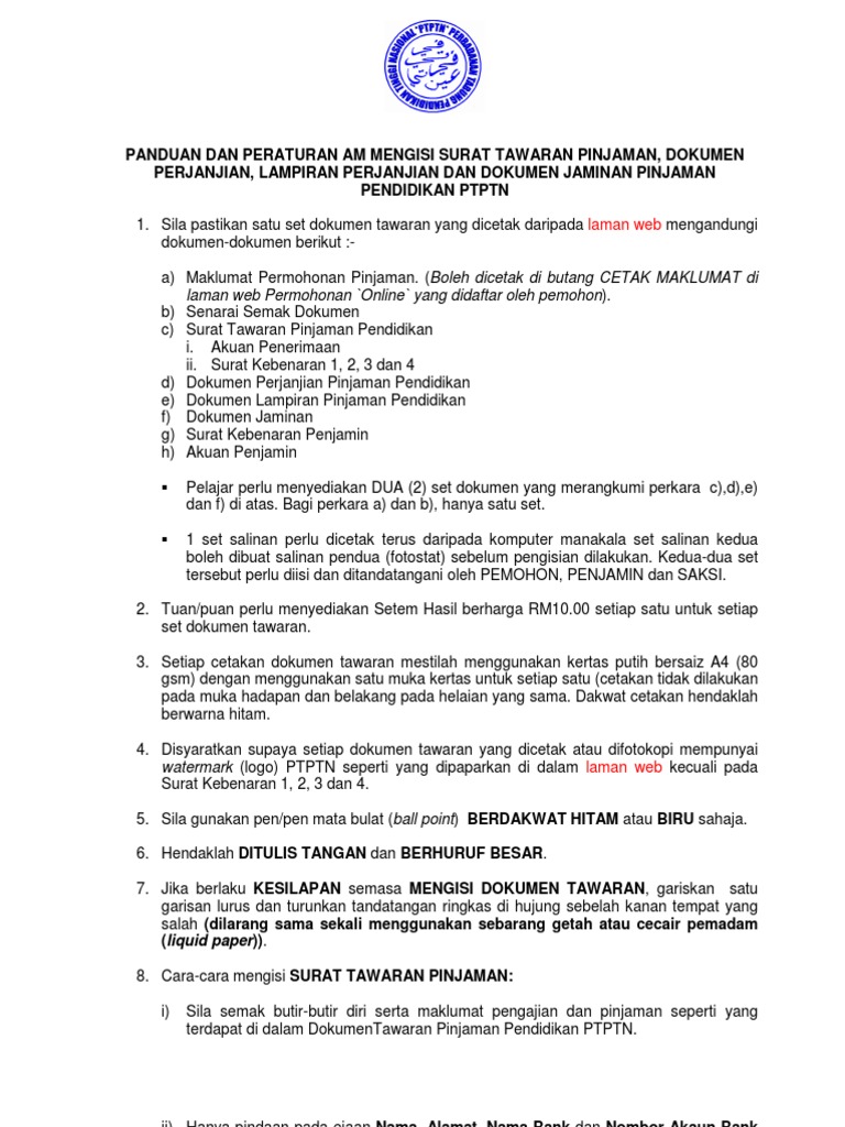 Dokumen perjanjian yang tidak mematuhi panduan pengisian akan ditolak dan perlu dikembalikan semula kepada ptptn dalam tempoh sah laku.