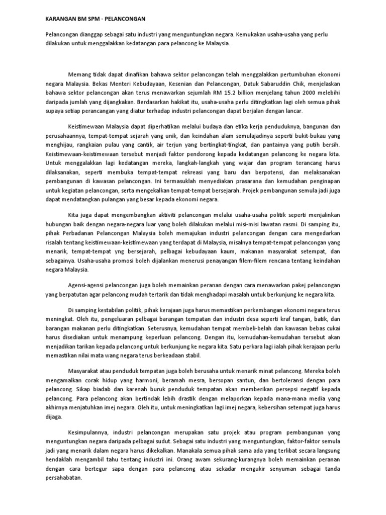 Faktor tarikan pelancong ke malaysia karangan spm. Memang tidak dapat dinafikan bahawa sektor pelancongan telah menggalakkan pertumbuhan ekonomi negara malaysia. Malaysia banyak memiliki kawasan rekreasi yang sesuai untuk dikunjungi oleh para pelancong antaranya ialah kawasan pantai yang bersih cantik dan berpasir putih seperti yang terdapat di pantai desaru pantai cahaya bulan dan sebagainya. Spm karangan cemerlang. Kemudahan pasar raya pusat beli belah dan industri perhotelan yang bertaraf antarabangsa dan disyorkan lima bintang menjadi tempat pelancong berkerumun.