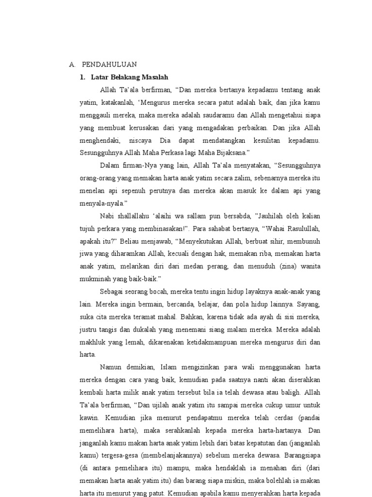 Hukum memakan harta anak yatim piatu. Oleh karena itu mengambil harta anak yatim dengan cara aniaya termasuk dosa besar. Dan janganlah kamu makan harta anak yatim lebih dari batas kepatutan dan janganlah kamu tergesa gesa membelanjakannya sebelum mereka dewasa. Sebab anak yatim adalah sos ok manusia yang sangat membutuhkan bantuan baik dibidang pendidikan kehidupan sehari hari seperti sandang papan dan lain lain. Jauhilah oleh kalian tujuh perkara yang merusak dan salah satu diantara perkara yang rasulullah sebutkan adalah memakan harta anak yatim hr.