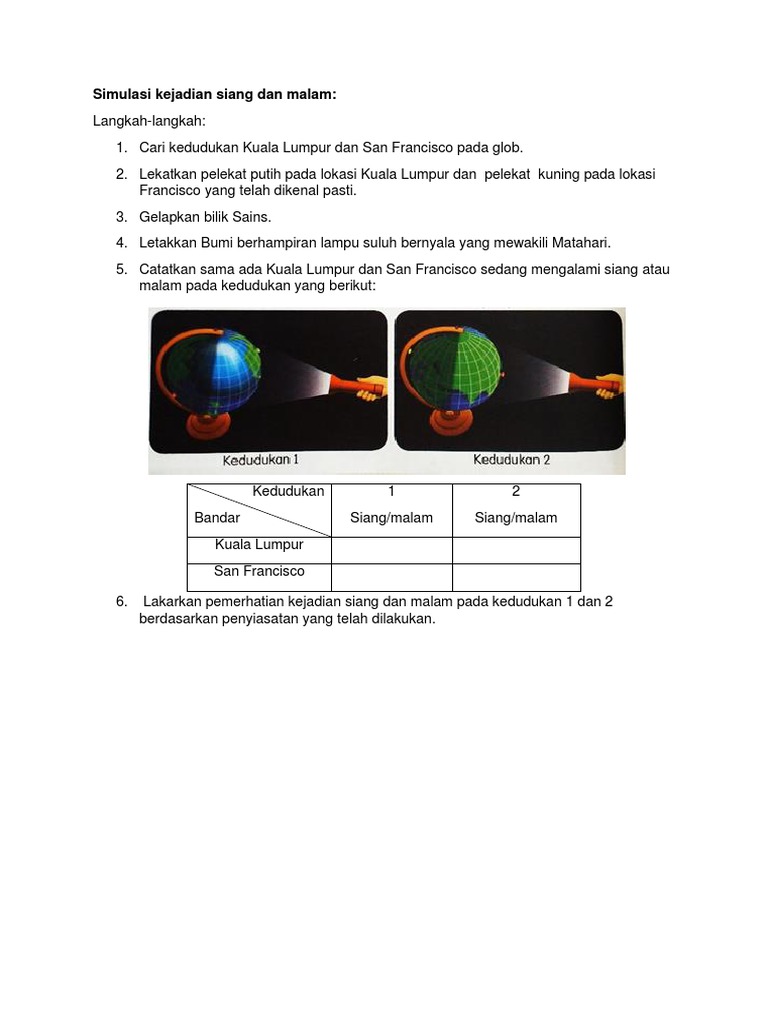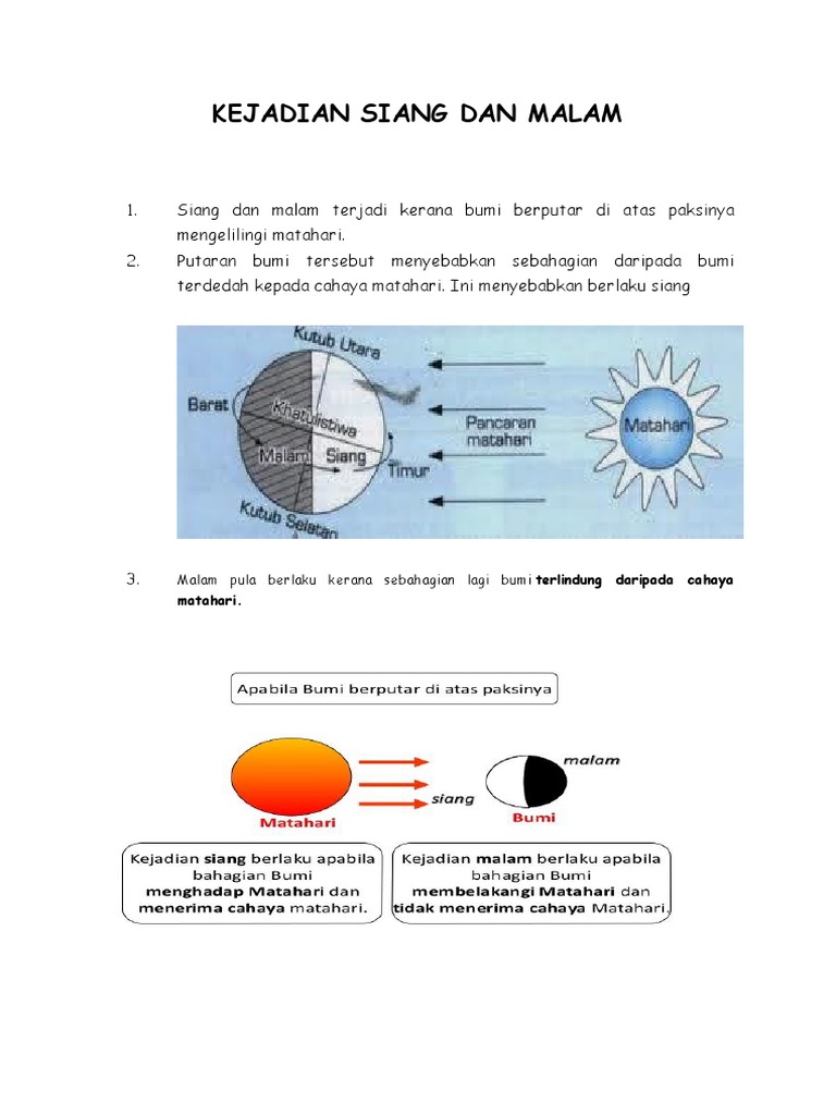 Kejadian siang dan malam sains. Sains tahun 4 semakan by. Perbezaan siang dan malam di sesuatu kawasan kecuali di kawasan garisan khatulistiwa disebabkan oleh kecondongan bumi iaitu 66 1 2 dari satah orbit hemisfera selatan mengalami waktu siang lebih panjang daripada waktu malam pada 22 hb disember. Dan beberapa diantaranya yaitu di surat al furqan ayat 47 dan 62 surat yasin ayat 37. Malam dan siang merupakan salah satu dari sekian banyak tanda tanda yang membuktikan bahwa alam ini pasti diatur oleh suatu zat yang amat luar bisa allah.