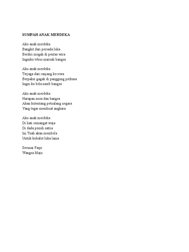 Kemerdekaan sajak aku anak merdeka. Yang rela memberikan keringat serta setia untuk bumi tercintanya. Aku anak merdeka bangkit dari persada luka berdiri megah di pentas wira inginku tebus maruah bangsa aku anak merdeka. Anak merdeka alaf baru. Wan muhamad shukri wan abd rahman.