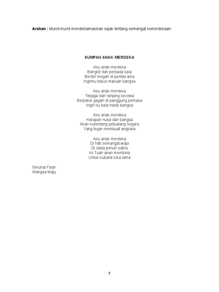 Pokok bangsa itu adalah kita anak merdeka alaf baru. Perdengarkan sajak aku anak merdeka luahan rasa kesyukuran lahir di bumi malaysia yang telah merdeka ini. Puisi patriotik bulan kemerdekaan sumpah anak merdeka aku anak merdeka bangkit dari persada luka berdiri megah di pentas wira inginku tebus maruah bangsa aku anak merdeka terjaga dari ranjang kecewa berpaksi gagah di panggung perkasa ingin ku bela nasib bangsa aku anak merdeka harapan nusa dan bangsa akan kutentang petualang negara yang tegar membuat angkara. Usah kau persoalkan tentang derita milik siapa di negeri kaya.