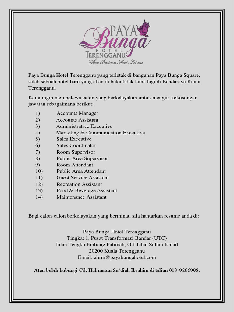 Kerja kosong kerajaan swasta mengikut negeri. Kerja kosong kerajaan negeri terengganu. D mempunyai pengalaman kerja sekurang kurangnya 4 tahun dalam akaun e menguasai sederhana dalam bahasa inggeris f amanah jujur rajin boleh dipercayai g boleh bekerja lebih masa h mempunyai kenderaan sendiri motorsikal atau kereta i mengikut arahan dan berdisiplin lokasi. Afy haniff group m sdn bhd jawatan kosong kota bharu temuduga terbuka akan diadakan pada.