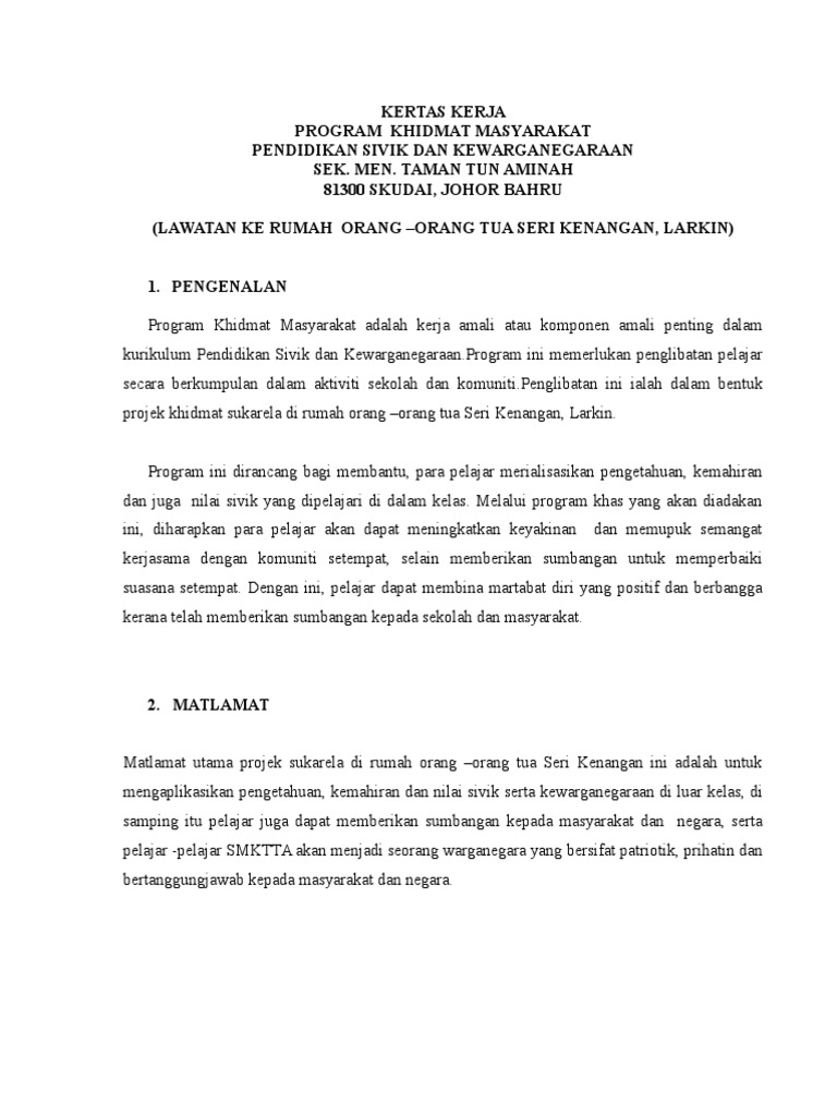 Kertas kerja program khidmat masyarakat di rumah orang tua. Kertas kerja lawatan ke rumah orang tua. Kertas kerja cadangan bagi program khidmat masyarakat di rumah anak anak yatim nurul ihsan sg siput 1 0 tujuan kertas kerja ini bertujuan untuk mendapatkan kelulusan seminar dan projek pelajar untuk menganjurkan program loving is caring bagi memenuhi syarat kerja kursus mata pelajaran khidmat masyarakat mpu 3412. Program khidmat bantu di rumah home help 4 program khidmat bantu dirumah 1. Oleh itu kertas kerja ini dirancang bertujuan untuk memenuhi kehendak kursus yang memerlukan pelajar menjalankan satu khidmat masyarakat.