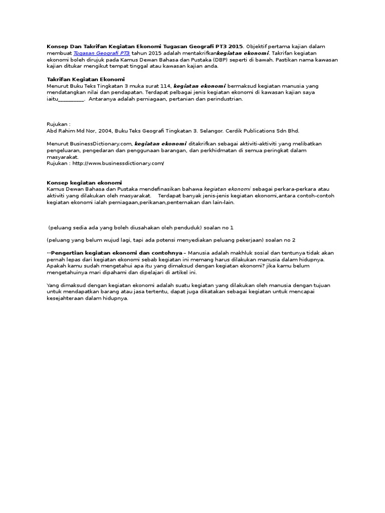 Konsep dan takrifan kegiatan ekonomi geografi pt3 2015 assalamualaikum objektif pertama kajian dalam membuat tugasan geografi pt3 tahun 2015 adalah mentakrifkan kegiatan ekonomi. Dewan bahasa dan pustaka tidak akan bertanggungjawab bagi sebarang kehilangan dan kerugian yang disebabkan oleh penggunaan maklumat yang diperoleh dari laman ini. Takrifan kegiatan ekonomi boleh dirujuk pada kamus dewan bahasa dan pustaka dbp seperti di bawah. Konsep takrifan kegiatan ekonomi tugasan pt3 geograf.