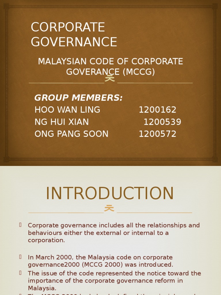 The malaysian code on corporate governance code first issued in march 2000 marked a significant milestone in corporate governance reform in malaysia. 2 2 the mccg reflects global principles and internationally recognised practices of corporate governance which are above and beyond the. The malaysian code on corpor ate governance 2000 aims to introduce goo d corporate governance in companies. The most crucial factor in the code is the i ndependence of the board and the chairman.