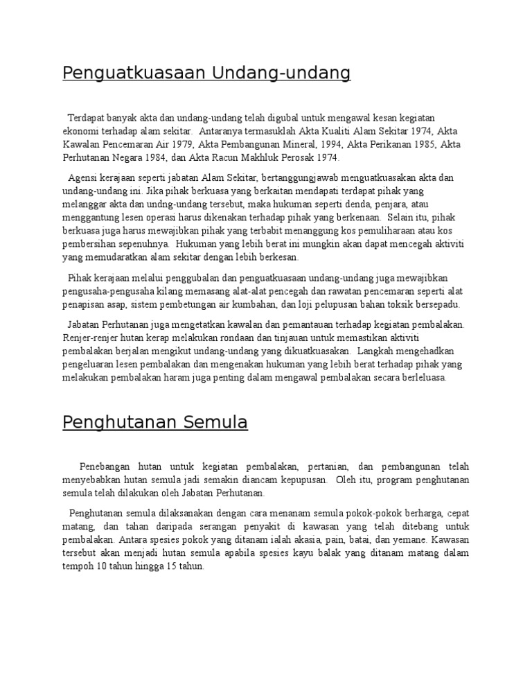 Oleh iu untuk mengembalikan kesegaran alam sekitar beberapa langkah menjaga alam sekitar perlulah diambil. Alam sekitar seharusnya dijaga kerana alam sekitar bukan hanya digunakan pada masa sekarang tetapi akan digunakan sehingga beratus ratus tahun lagi. Melalui langkah penguatkuasaan undang undang jabatan alam sekitar jas merupakan jabatan di bawah kementerian sumber asli dan alam sekitar nre yang memainkan peranan untuk mempertingkatkan penguatkuasaan akta kualiti alam sekeliling 1974 dan peraturan peraturan di bawahnya yang menyekat pencemaran dari punca tetap point sources dengan izin. Penguatkuasaan undang undang di malaysia dilakukan oleh banyak agensi penguatkuasaan undang undang dan biasanya datang di bawah bidang kuasa langsung dari polis diraja malaysia utama kerajaan agensi dipercayakan dengan penyelenggaraan hukum dan perintah di negara ini seperti banyak persekutuan bangsa bangsa sifat perlembagaan malaysia mandat hukum dan ketertiban sebagai subjek negeri itu.