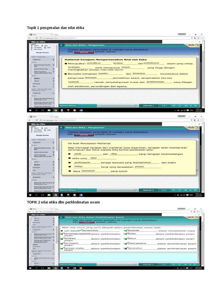 Objektif diakhir kursus. 150 b kategori kursus yang diikuti. Nilai etika disiplin diri dalam melaksanakan sesuatu tugasan. Buku nilai dan etika dalam perkhidmatan awam memberi definisi nilai sebagai kepercayaan yang mendorong seseorang atau sesebuah institusi untuk bertindak mengikut pemilihan yang berasaskan nilai nilai utama masyarakat.