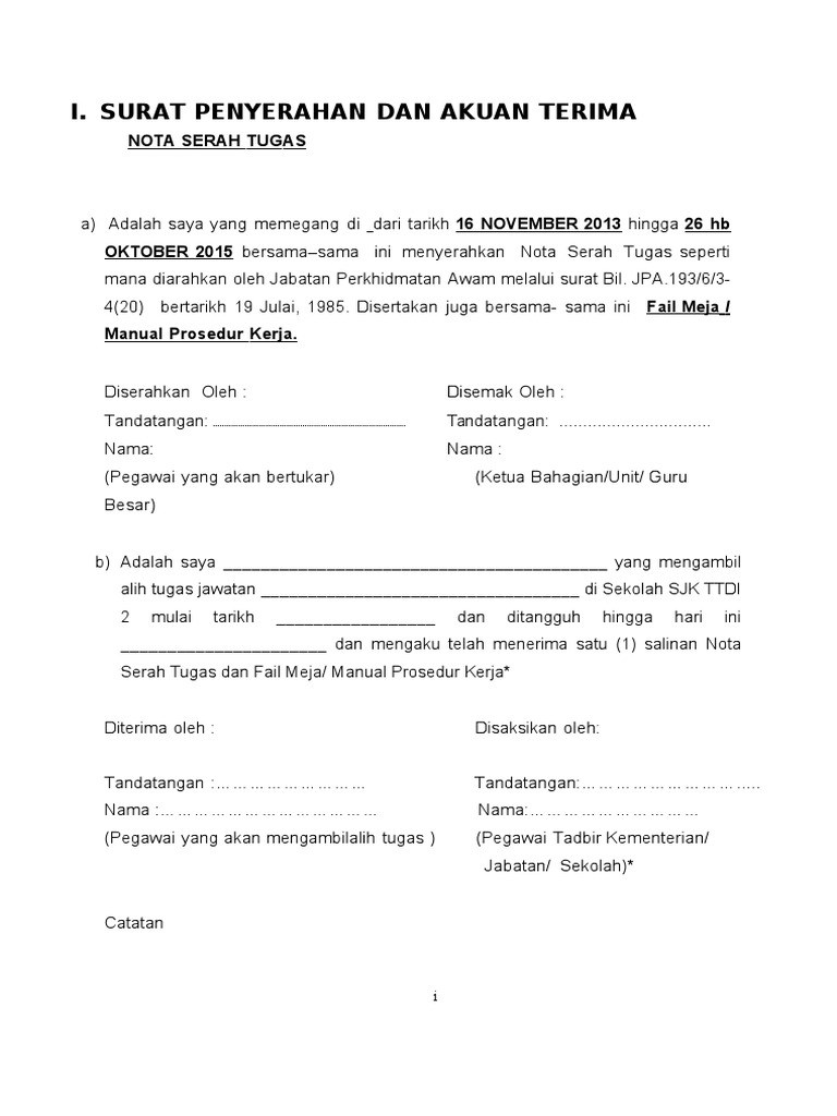 A adalah saya nasaruddin bin darus yang memegang jawatan guru penolong di kementerian jabatan sekolah kebangsaan chepir dari tarikh 1 1 2006 hingga 16 februari 2019. Surat penyerahan dan akuan terima nota serah tugas 2. Nota serah tugas mesti disiapkan sebelum berpindah dan lengkap ditandatangani oleh guru besar dan pegawai yang menerima tugas daripada pegawai bertukar. Senarai hartabenda peralatan pejabat 5.
