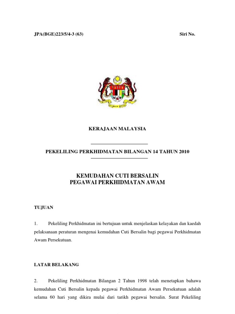 Pekeliling cuti isteri bersalin 14 hari. Penjawat awam malaysia berhak untuk cuti isteri bersalin selama 7 hari. Panduan pilihan kemudahan cuti bersalin antara 60 hingga 90 hari adalah seperti di lampiran a. Kerajaan bercadang memanjangkan cuti paterniti berbayar kepada 14 hari berbanding tujuh hari sekarang untuk suami kakitangan awam bagi mengambil alih tugas isteri menempuh cuti bersalin. Jika masih tidak mencukupi cuti bersalin tanpa gaji digunakan.