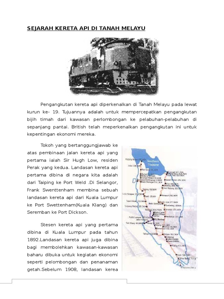 Perkembangan pengangkutan kereta api di malaysia. Sejarah kereta api pertama 1885 1896 pengangkutan rel di malaysia bermula 1 jun 1885 apabila jajaran keretapi yang pertama di tanah melayu sepanjang 8 25 batu 13 28 km antara taiping dengan port weld dibuka secara rasmi. Bab15 jaringan pengangkutan 1. Penggunaan kereta api di malaysia pada permulaannya adalah untuk mengangkat bijih timah yang bermula pada 1 jun 1885 dari taiping ke port weld. Faktor faktor yang mempengaruhi jaringan pengangkutan di malaysia bentuk muka bumi jalan raya dan jalan kereta api sesuai dibina di kawasan tanah pamah lembah sungai dan pinggir pantai.