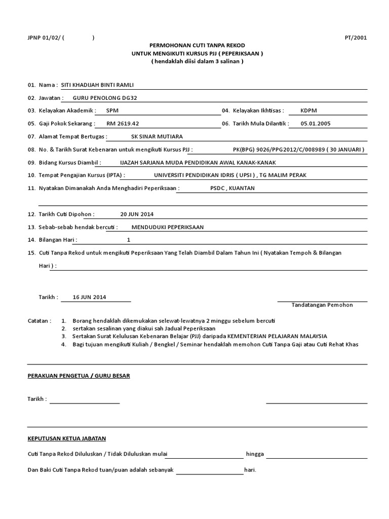 Permohonan cuti tanpa rekod pada 18 mac 2016 dengan hormatnya saya merujuk kepada perkara di atas dan lampiran yang disertakan adalah berkaitan. Universiti malaysia sabah permohonan cuti tanpa rekod gantian bo rang 2 2bc6 05 bahagian sumber manusia rujukan a 1 diluluskan oleh pendaftar 17 02 05 dokumen ini adalah dikawal mukasurat 1 dari 2 borang permohonan cuti tanpa rekod gantianborang permohonan cuti tanpa rekod gantian 2 2bc6 05 nama. 2 untuk makluman tuan saya akan menduduki peperiksaan pertengahan semester bagi sesi januari 2016 2017 program pendidikan jarak jauh pjj yang akan diadakan pada 18 19 mac 2016 jumaat sabtu. Peperiksaan khas psl yang berkenaan tanpa alasan yang munasabah hendaklah dikenakan tindakan penangguhan sebanyak tiga 3 siri peperiksaan khas psl oleh panel peperiksaan.