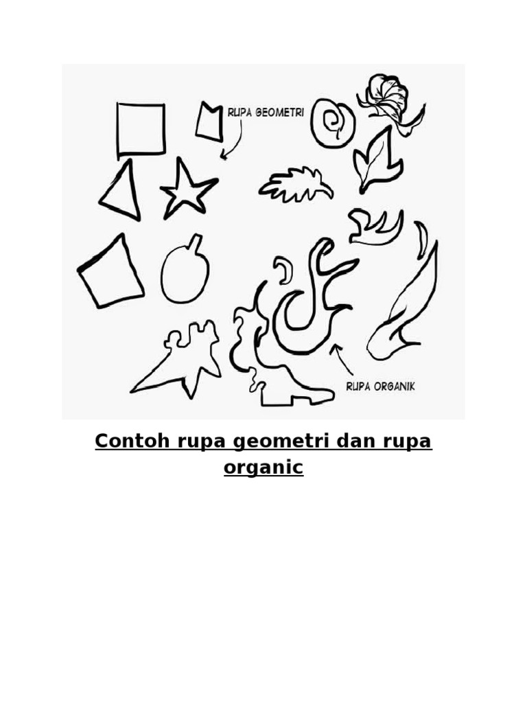 Rupa organik dan geometri. Selasa 16 oktober 2012. Rupa adalah rata dan bersifat dua dimensi ia tidak mempunyai jisim ton warna dan jalinan. Dicipta dengan menggunakan alatan khas iaitu pembaris set geometri dengan ukuran ukuran tertentu. Rupa geometri ialah rupa yang.