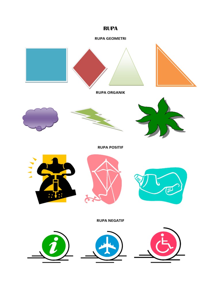 Rupa geometri meliputi rupa bulat segi empat sama segi tiga dan rupa rupa lain yang bersudut dan direka dengan sengaja. Rupa geometri lebih kepada rupa yang mempunyai sudut dan penjuru bulatan lonjong segi empat sama berlian segi tiga segi empat tepat trapezium rombus. Pertumuan antara permulaan dan penghujung sesuatu garisan menghasilkan rupa. Rupa organik mempunyai permukaan yang bebas dan tidak terikat pada.