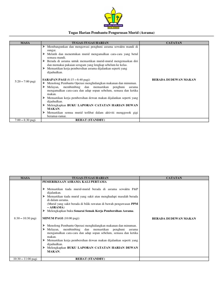 Membantu melaksanakan tugas tugas domestik penginapan dan keselamatan alat alat terjaga serta sajian makanan. Senarai tugas 1 2 carta organisasi staf sokongan 2 3 kedudukan perjawatan sekolah 3 4 senarai tugas kuasa dan hubungan pegawai dengan pegawai pembantu am rendah 4 5 peraturan peraturan pentadbiran proses kerja carta aliran dan 5 8 6 senarai undang undang dan peraturan peraturan yang diperlukan 9 7 norma kerja kerja bagi tugas tugas 10 8. Antara tanggungjawab atau deskripsi tugas penyelia asrama gred n19 adalah seperti berikut. Merujuk kepada hebahan suruhan perkhidmatan pelajaran antara jawatan yang terlibat untuk sesi temuduga akan datang ialah pembantu pengurusan murid pembantu makmal penyelia asrama dan pembantu operasi.