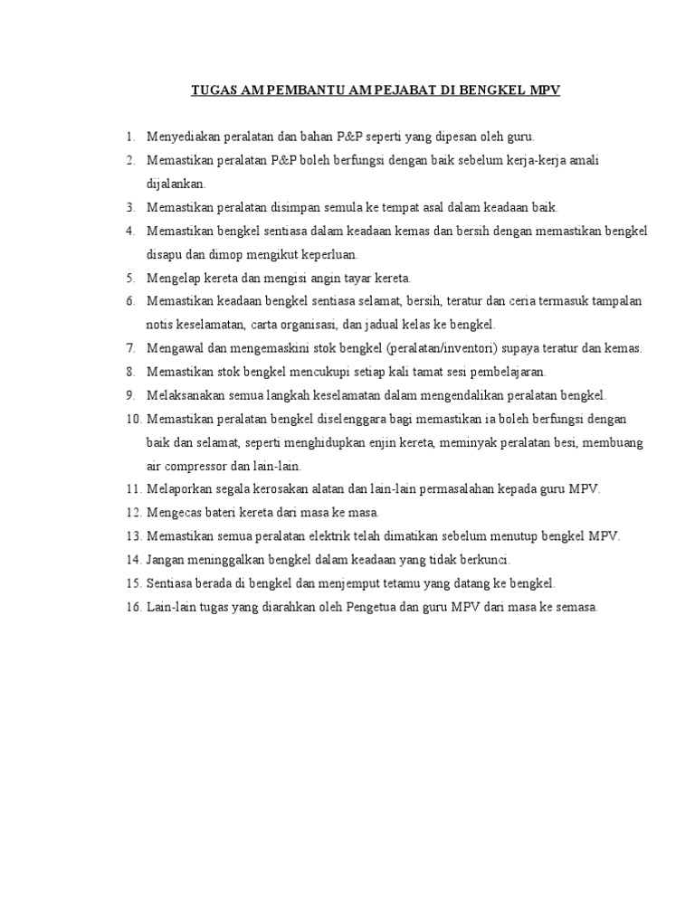Senarai tugas pembantu operasi bengkel. Skim perkhidmatan pembantu operasi pembantu awam operator wayarles dan pembantu tadbir perkeranian operasi yang baharu adalah seperti di lampiran a a1 a2 dan a3 format iklan jawatan adalah seperti di jadual gaji lampiran b minimum maksimum jgmm adalah seperti di dan c1 danlampiran c. Bertanggungjawab melaksanakan tugas tugas operasi am bersifat hands on yang memerlukan keupayaan fizikal di dalam pejabat jeti. Pembantu operasi n11 ni dimana mana kementerian pon ada. Senarai tugas harian peraturan peraturan pentadbiran carta alir kerja proses kerja.
