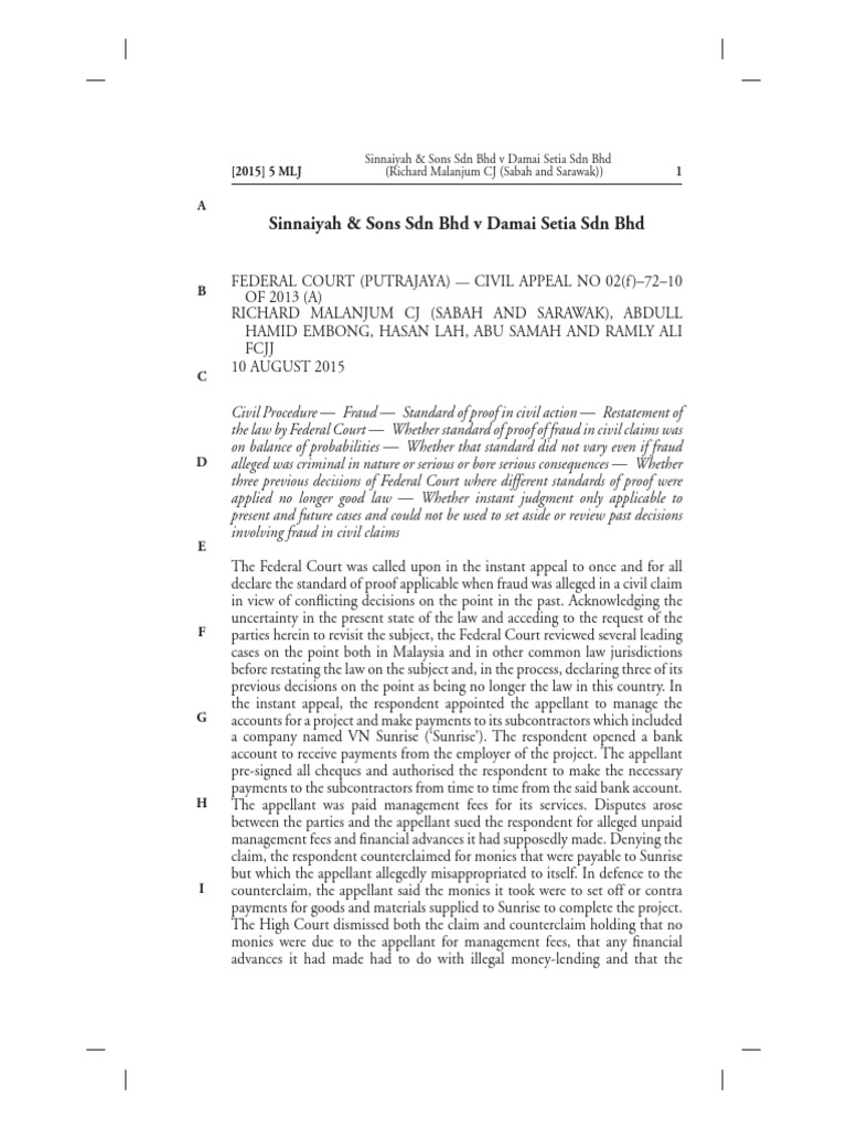 I the balance of probabilities albeit a balance on a higher degree depending on the seriousness of the fraud. Sinnaiyah sons sdn bhd v damai setia sdn bhd 2015 5 mlj 1. Evidence standard of proof for fraud in civil claims 2015 7 clj 584 fc court of appeal. The federal court has drastically up ended the law via the decision of sinnaiyah sons v damai setia 2015 5 mlj 1.