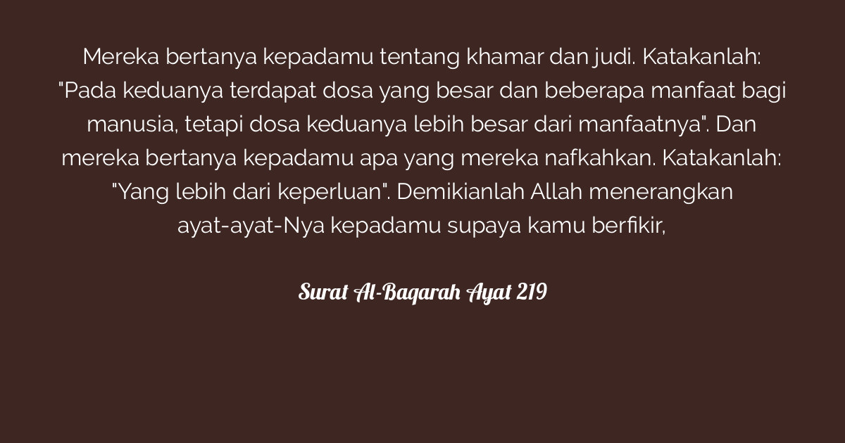 But the sin is greater than the profit they ask thee how much they a. Sedangkan yang lainnya sudah meninggalkannya hingga akhirnya diharamkan oleh sebuah ayat dalam surat al maidah. Karena itulah maka umar ibnul khattab ketika dibacakan ayat ini kepadanya mengatakan. Quran surah al baqarah 219 image and transliteration yasaloonaka aaani alkhamri wa a lmaysiri qul feehim a ithmun kabeerun waman a fiaau li l nn a si waithmuhum a akbaru min nafaaihim a wayasaloonaka m atha yunfiqoona quli alaaafwa ka tha lika yubayyinu all a hu lakumu al a y a ti.