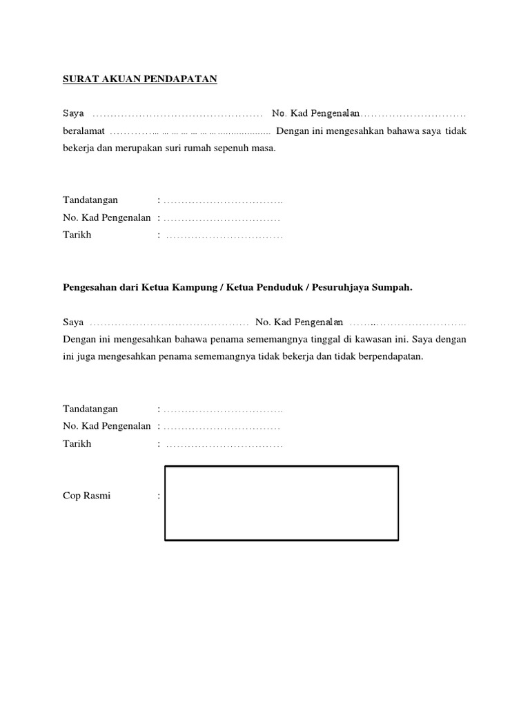 Contoh surat akuan sumpah ibu tidak bekerja contoh surat akuan pendapatan dibawah boleh dijadikan rujukan untuk meraka yang berkerja sendiri pengesahan pendapatan ibu bapa yang tidak bekerja pengesahan pendapatan ibu bapa untuk memohon ptptn mara dan sebagainya akuan penyata pendapatan pendapatan tidak bekerja dan lain lain lagi. Saya penama seperti bermaklumat di bawah dengan ini mengakui bahawa saya adalah seorang suri rumah dan tidak bekerja. Surat akuan tidak bekerja saya shahrul effendi bin md zamri. Pengesahan dari ketua kampung ketua penduduk pesuruhjaya sumpah.