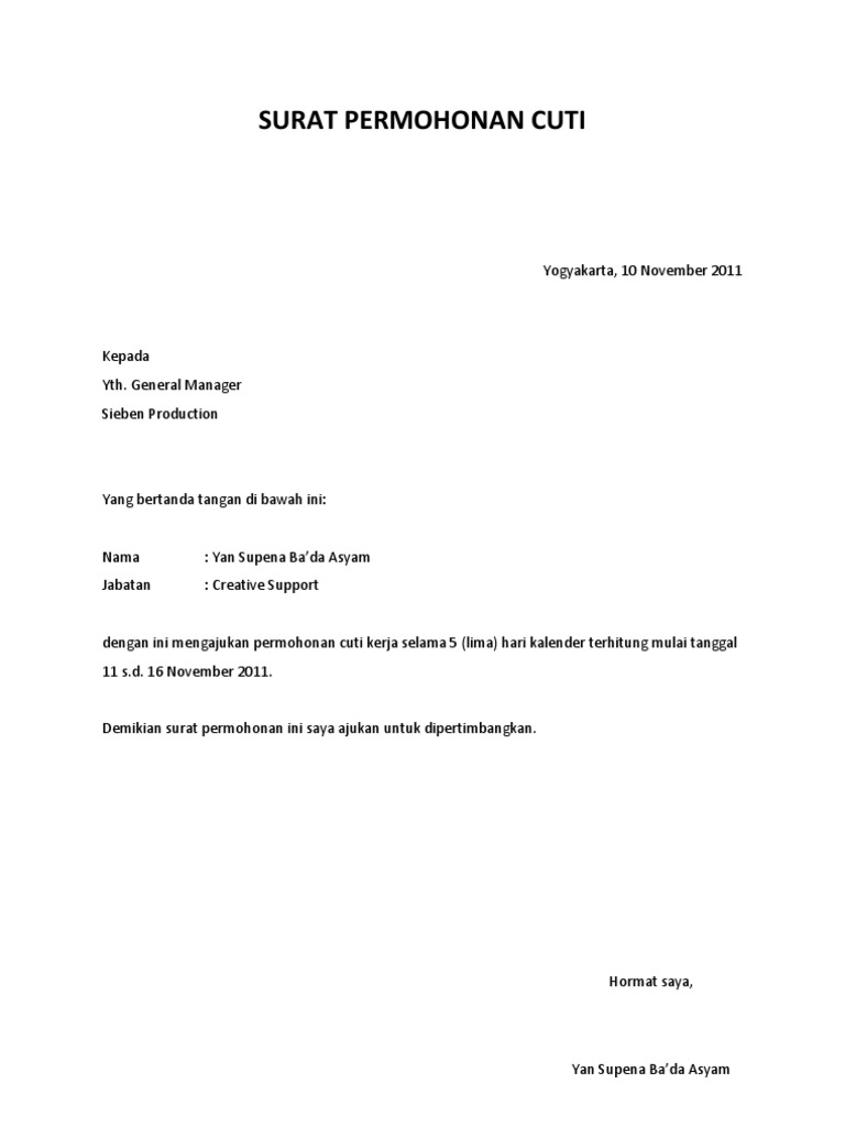 Surat cuti merupakan surat yang dibuat sebagai bentuk pemberitahuan atau permohonan izin ke perusahaan agar dapat diberikan izin tidak masuk kerja sehingga memberikan kesan baik bagi seorang karyawan terhadap perusahaan. Nah itulah tadi beberapa contoh surat permohonan cuti yang bisa anda pergunakan sebagai bahan referensi. Surat permohonan cuti kerja lampiran. Begitu juga dengan mahasiswa i yang mungkin ingin cuti dikarenakan sesuatu hal.